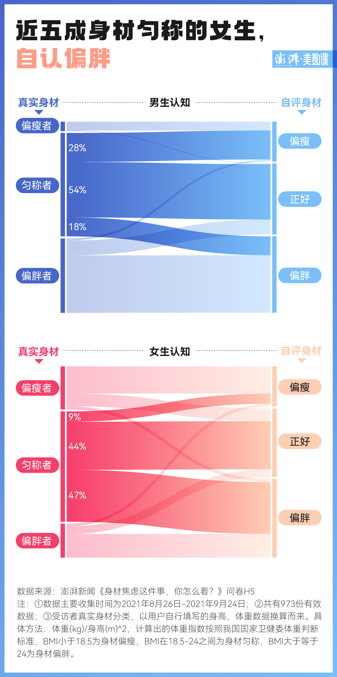 我们根据受访者自行填写的身高、体重数据,折算出BMI指数,再与每位受访者的自评价题答案进行对比,中间有不少错位。