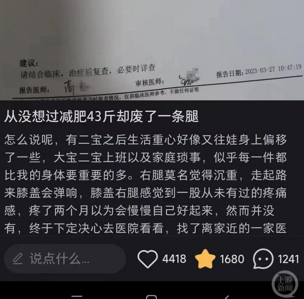当事人还在笔记中描述:“感觉右腿废掉了,我也是后来才知道大基数减肥(近似于体重偏重的人群减肥)不能先跑步,会伤到膝盖。后面我会更新我看腿的经历,还有去过的医院看病流程,希望能帮到跟我一样的兄弟姐妹。”