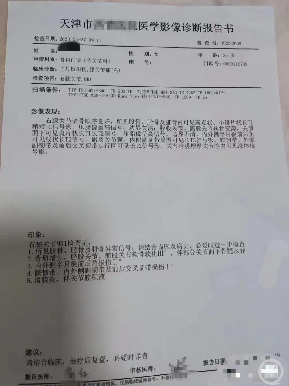 5月11日,上游新闻(报料邮箱baoliaosy@163.com)记者联系了当事人,可她并未回复私信。从她发出的医学影像诊断报告书显示,她今年35岁,在与网友的互动中曾表示自己身高1.60米,跑步前体重为163斤。她跑步锻炼后成功减重43斤后,发现右腿莫名沉重,走起路来膝盖会弹响,右腿感觉到一股从未有过的疼痛感。疼了两个月后无好转,只能去天津市某医院看病,结果被诊断为半月板损伤和膝关节损伤。