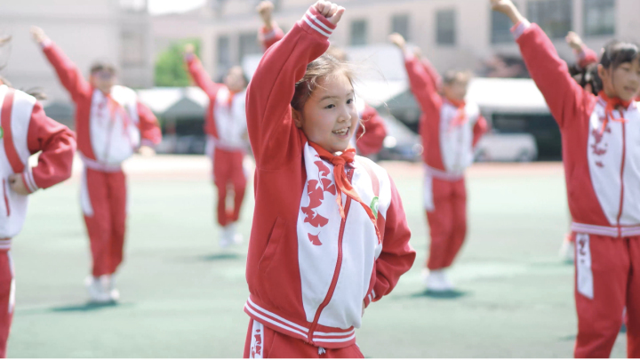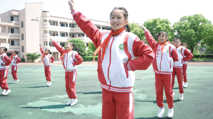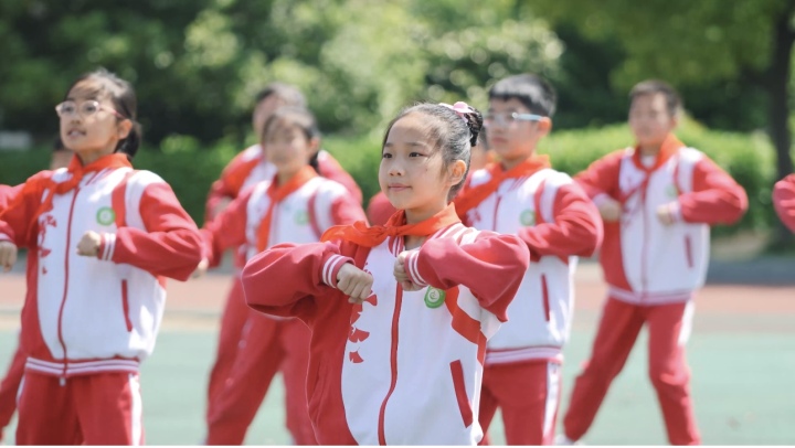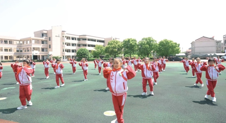“交叉步甩肩”“侧身展臂”“扩胸拉肩”……现在来到绍兴市上虞区道墟街道中心小学,大课间的操场上,可以看到学生在律动的音乐中,演绎学校新创编的活力健身操《从现在到未来》。
