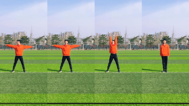 第二部分适用于大课间及室外健身运动。在欢快的音乐中,通过练习逐渐激活身体各部位,灵活颈部、胸部和腰部的脊椎关节,同时提高学生身体的协调性、灵活性,舒展身体、放松心情、塑造形体,培养良好的身体姿态。
