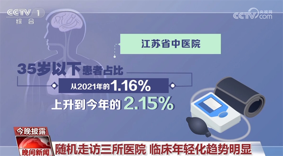 总台记者随机走访了北京、江苏、河南三所医院的高血压门诊发现:河南省洛阳市第一人民医院,2022年接诊的3000多名患者中,低于30岁的有21人;江苏省中医院,35岁以下患者占比从2021年的1.16%,上升到今年的2.15%;北京安贞医院的数据则显示,70%的门诊患者为中青年群体。