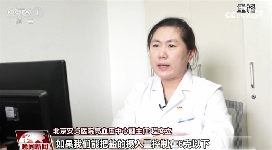 北京安贞医院高血压中心副主任程文立:如果我们能把盐的摄入量控制在6克以下,那么血压能够降低大概三到六个mmHg这么多,所以说食盐对血压影响其实是很大的。