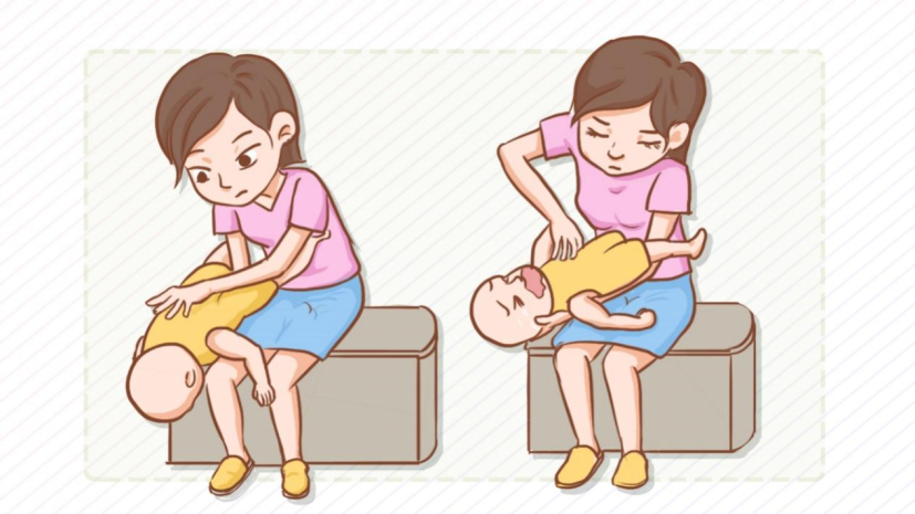 如果是一岁以内的小婴儿气道异物,马上用一只手固定他的头颈部,把他翻转过来趴到你的前臂上,两条腿骑跨在你的胳膊上。然后用手掌根部叩击婴儿的肩胛间区,就是两个肩胛骨之间。连续叩击五次之后,翻过来脸朝上,看看婴儿嘴里有没有异物。