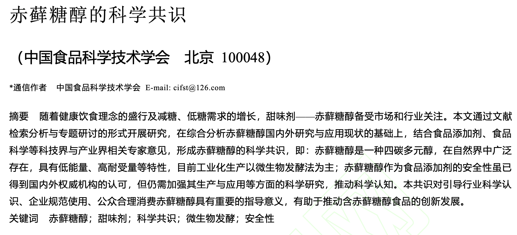 图:《中国食品学报》网络首发论文,题目:赤藓糖醇的科学共识,作者:中国食品科学技术学会