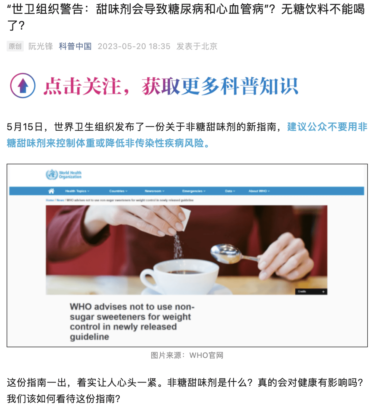 该报告一经发布,在国内也产生广泛的影响。其中,“科普中国”作为中国科协深入推进科普信息化建设,以科普内容建设为重点的权威媒体,率先跟进了该新闻的报道,其与5月20日晚间发布的推文《“世卫组织警告:甜味剂会导致糖尿病和心血管病”?无糖饮料不能喝了?》,权威解读了该报告。其作者科信食品与营养信息交流中心科学技术部主任阮光锋写到:世卫组织这个指南里说的非糖甜味剂,跟我们常说的“代糖”并不完全一样。和糖相比,它们(糖醇物质)的特点是有甜度,但能量低,往往也会有那么一点点的热量,不过远不如真正的糖那么多,有的热量极低,几乎可以视为0。在文章最后,阮光锋也表示,如果膳食总量不变,用甜味剂替代添加糖,确实是可以减少能量摄入的。