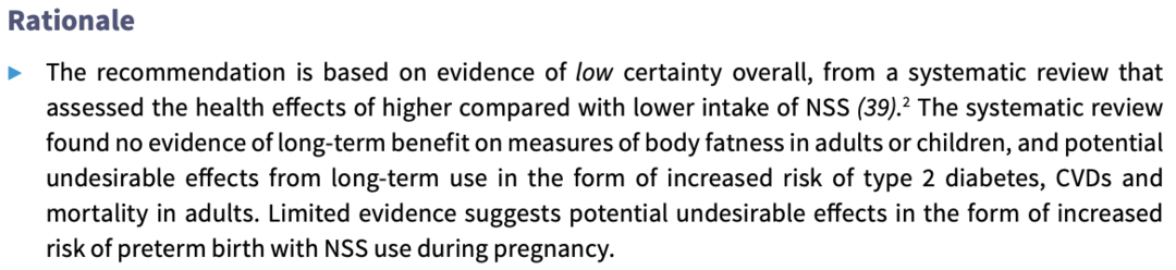 世卫组织还指出,证据的总体确定性被评估为低,并且是基于在前瞻性队列研究中观察到的使用非糖甜味剂对优先健康结果的不良影响,这些研究被单独评估为具有非常低到低的证据确定性(verylowtolowcertaintyofevidence)。而在表达结论上,世卫组织也使用了“可能”“潜在”等字眼。