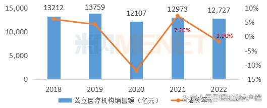 (人民日报健康客户端记者高瑞瑞)6月4日,据米内网微信公众号发布,2022年中国公立医疗机构药品的销售额为12727亿元,同比2021年下降了1.90%。