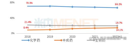 米内网数据显示,从药品类型看:在2022年公立医疗机构终端,化学药的占比最大,超过66%,但市场地位持续下降,同比2021年下降3.9%,其中集采对化学药销售额的影响最大;中成药的占比为19.7%,同比2021年增长0.24%,2022年在政策加持和终端需求的陆续复苏下,另外据统计,近十年来中成药的销售额增速首超化学药,销售势头稳定向好,政策支持和终端需求的陆续复苏是中成药市场稳定向好的主要原因;生物药的市场份额持续上升,市场地位不断提高,其2022年销售额增速达5.3%,远高于化学药和中成药,但整体增速放缓。