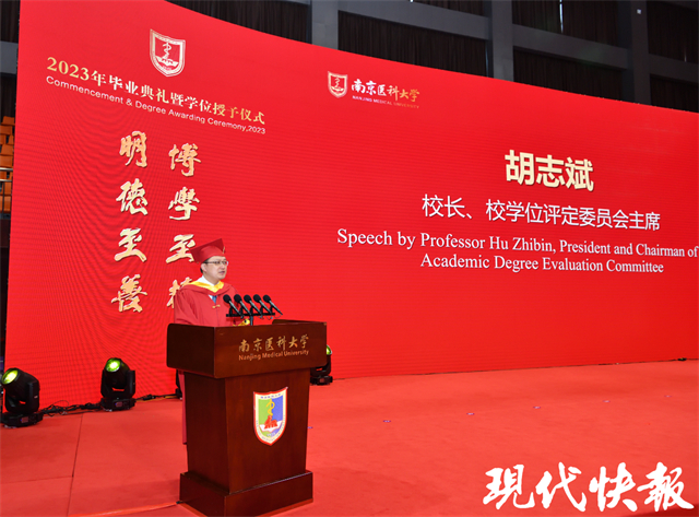 毕业典礼现场,南医大校长胡志斌代表学校向圆满完成学业的2023届毕业生表示热烈祝贺。他在致辞中表示,求学南医期间,同学们亲历了强国建设、民族复兴新征程上的日新月异,见证了学校逐梦远方、问鼎一流发展路上的蓬勃生机,用一次次的青春奋斗塑造了“能为、敢为、善为”的南医学子群像。希望全体毕业生在新的人生征程上继续答好“为什么要学医”“为什么要坚守医疗一线”“为什么要选择从事医学研究”的青春“三问”,坚定医学初心、践行医学使命、攀登医学高峰,奋力书写好人生答卷上的每一笔,无憾青春答问,不负美好时代。