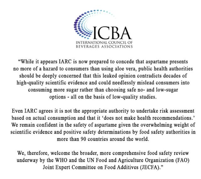 “就连国际癌症研究机构(IARC)也承认,其并不是根据实际消费情况进行风险评估的权威机构,而且它‘不提出健康建议’。”ICBA执行董事凯特·洛特曼(Kate Loatman)称,“我们仍然对阿斯巴甜的安全性充满信心,因为有压倒性的科学证据和全球90多个国家食品安全当局做出的积极安全决定。因此,我们欢迎世卫组织和联合国粮食及农业组织食品添加剂联合专家委员会(JECFA)正在进行的更广泛、更全面的食品安全审查。”