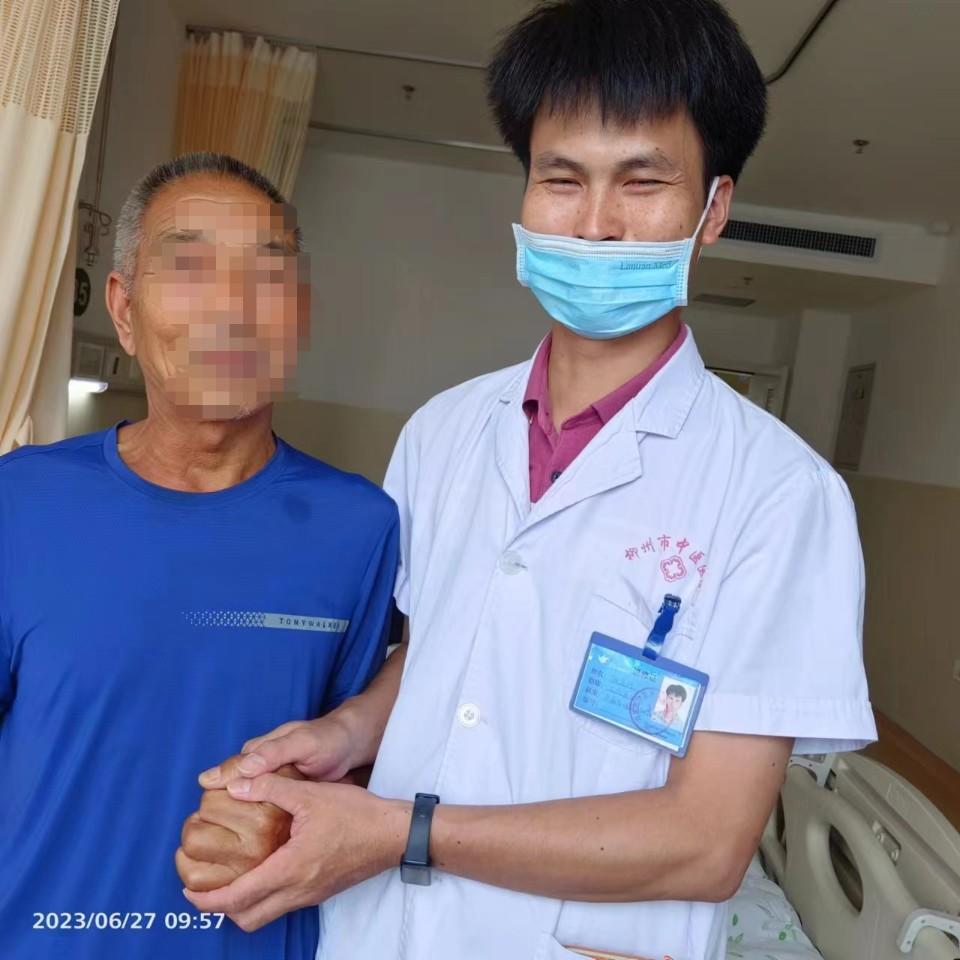 出院时,郭先生激动地握住主管医生张大夫的手表示感谢。