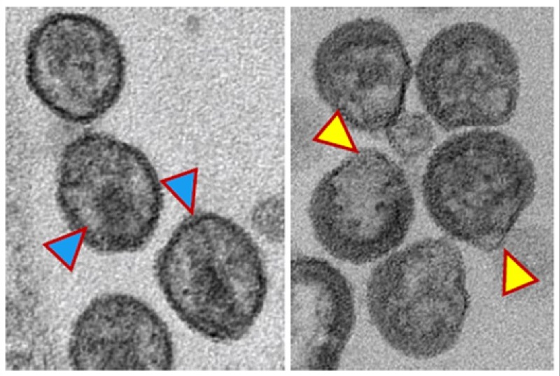 PDDC治疗后成熟的HIV颗粒(蓝色箭头)和未成熟的变形HIV颗粒(黄色箭头)的电子显微镜图像,PDDC阻止了病毒的生长。图片来源:美国国立卫生研究院