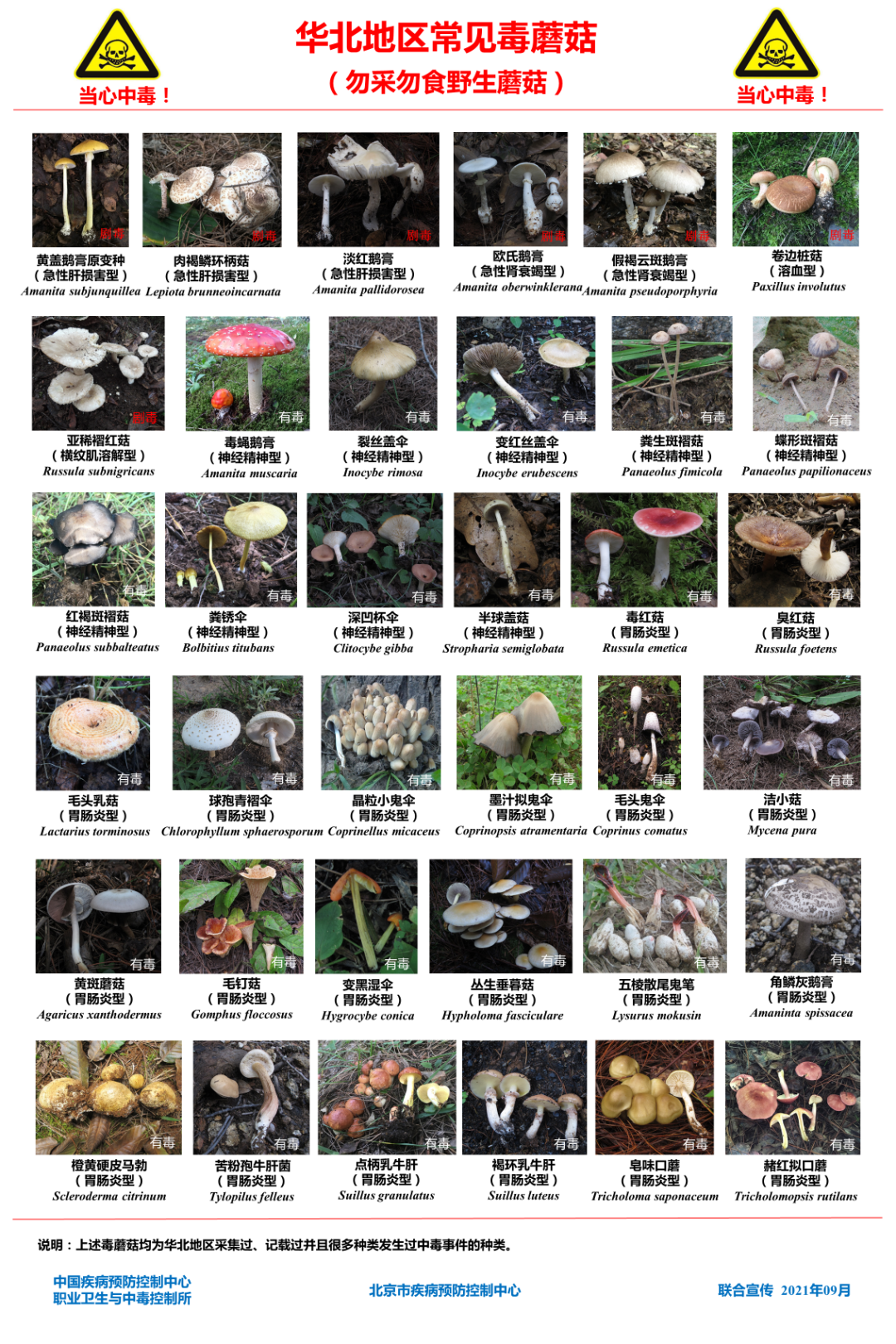 你以为不采食以上这些常见的毒蘑菇,遇到其它的野生蘑菇就可以大吃一场了?目前,在我国已报道的毒蘑菇有500多种,其中华北地区常见的毒蘑菇如下图所示: