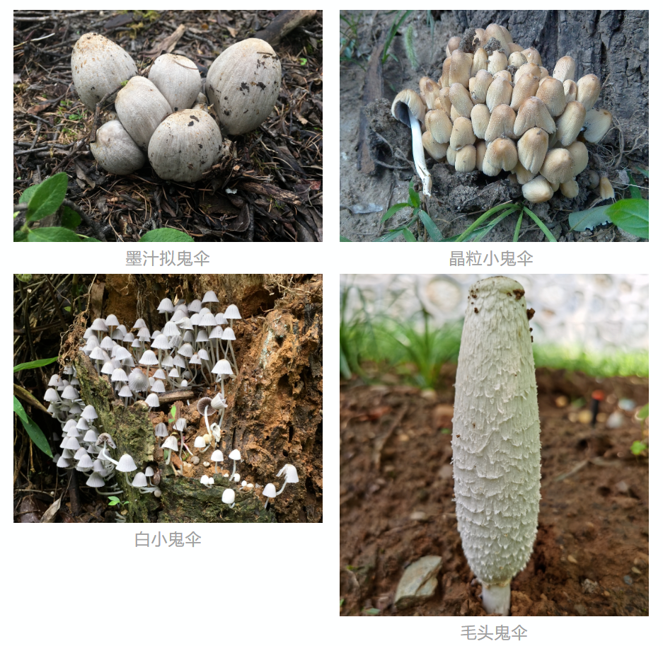 毒菇档案:北京市鬼伞类常见的有墨汁拟鬼伞、毛头鬼伞、晶粒小鬼伞和白小鬼伞等。该类蘑菇菌褶成熟时为黑色并且有自溶现象。该类群含有鬼伞素,可引起胃肠炎型中毒。