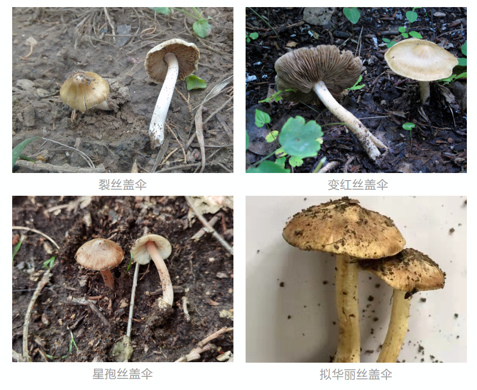 毒菇档案:北京市常见的主要有裂丝盖伞、变红丝盖伞、星孢丝盖伞和拟华丽丝盖伞等。它们的主要特征为子实体浅褐色、黄褐色、褐色,小型,菌盖被多纵向纤毛,中部有的有凸起,菌柄基部与菌柄等粗或膨大。它们含有毒蕈碱,临床表现为典型的副交感神经刺激症状,如出汗、流涎、流泪、瞳孔缩小等症状,还经常伴有心搏过缓、呼吸急促,视力模糊,甚至出现幻觉等。中毒程度与毒蘑菇食用量呈正比,偶尔发生严重的中毒事件,极少造成死亡。