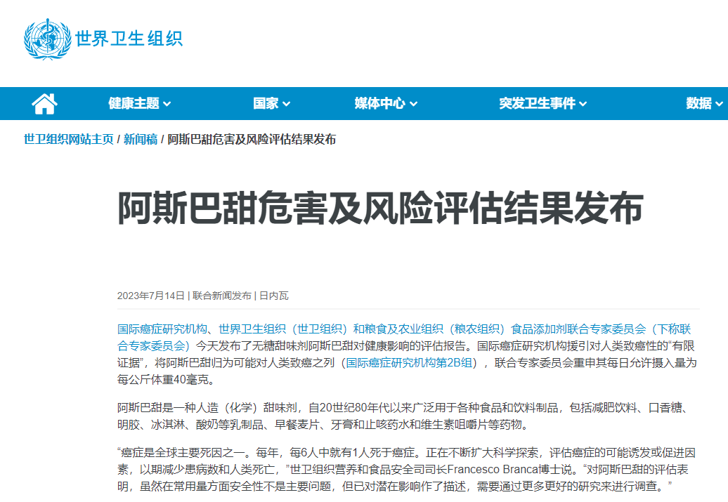 世界卫生组织于7月14日用中文、英文同时发布的《阿斯巴甜危害及风险评估结果发布》显示,国际癌症研究机构援引对人类致癌性的“有限证据”,将阿斯巴甜归为可能对人类致癌之列。