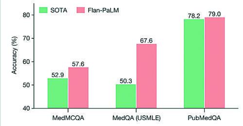 图为研究团队的方法和现有技术的比较。Flan-PaLM540B模型在MedQA,MedMCQA和PubMedQA数据集上均超过了以往最先进的SOTA,每列上方显示的是准确率百分比。图片来源:《自然》