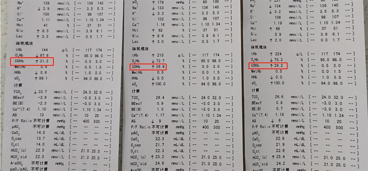 血气分析结果显示三位患者碳氧血红蛋白浓度都超标