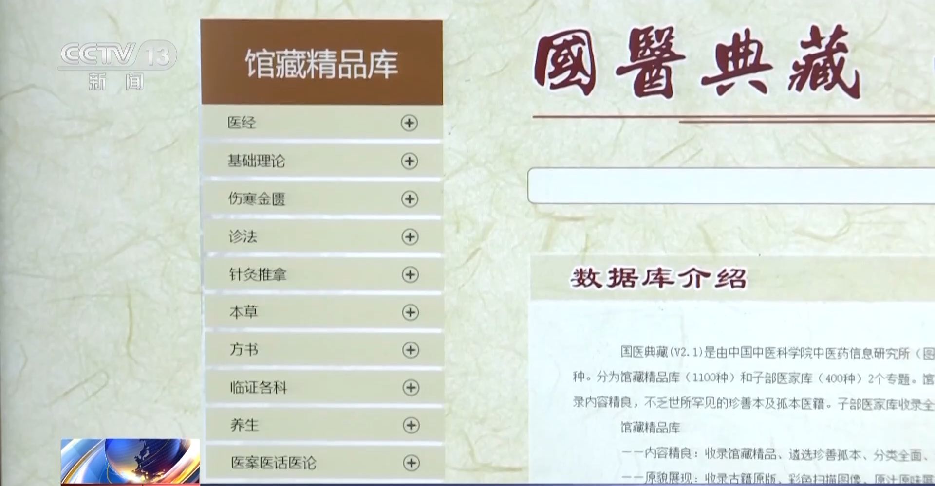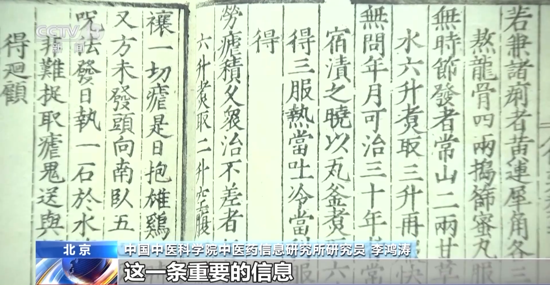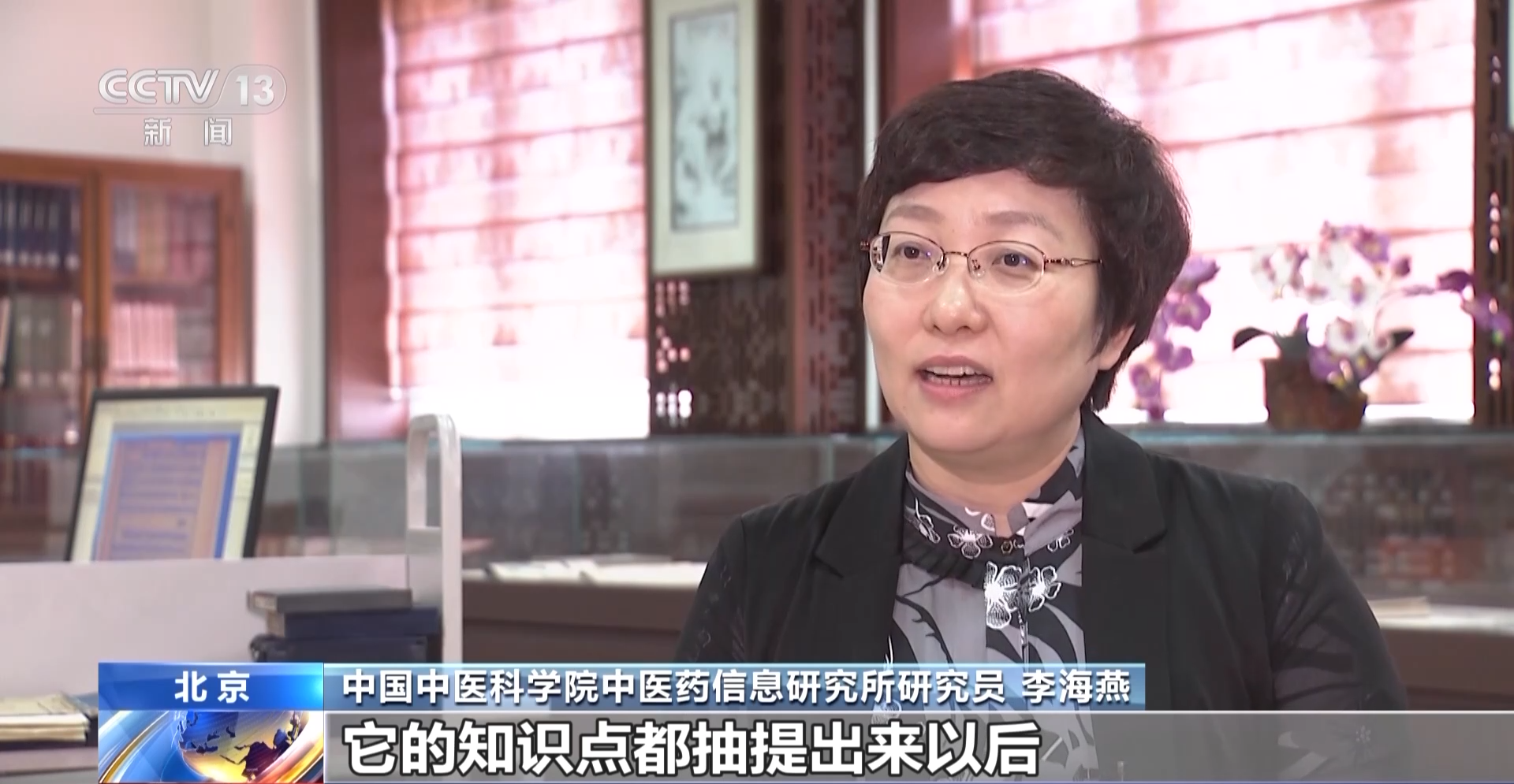 中国中医科学院中医药信息研究所研究员李海燕:通过知识处理,把所有的古籍的知识点都抽提出来,形成的一种知识库,这个知识库就相当于一个古籍的大数据,所以你可能会得到一些,你单看一本古籍难以发现的一些知识。比如说我们可能去分析一些古代的方剂,它可能会对于某些病症有没有一些什么样的作用,我如果单看一本书的话,往往是一家之言,一个观点,但是我们去拿这些所有的1000种古籍,甚至更多的古籍去汇聚得出来的数据呢,往往我们就会形成一种规律性的认识。