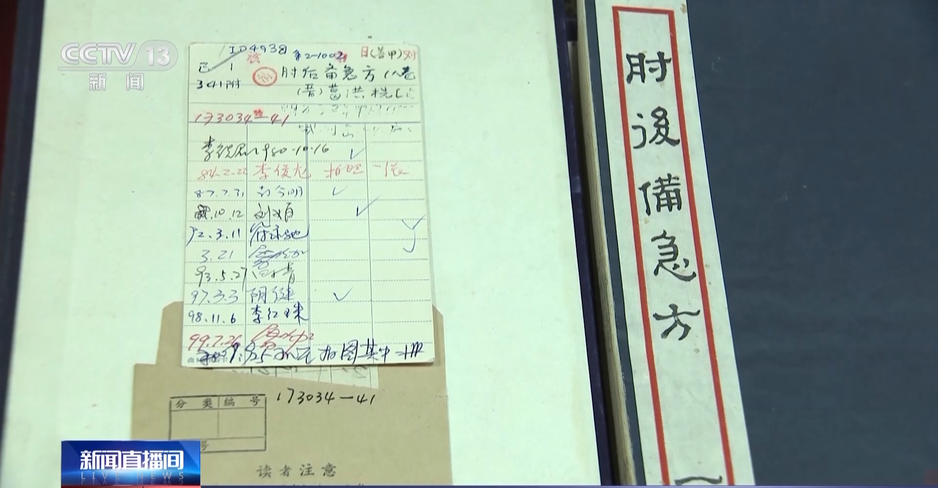 在古籍《肘后备急方》的多个版本中记者都发现了中国中医科学院研究员屠呦呦的书袋签名卡。为汲取古代有关抗疟实践经验,屠呦呦研究员先后多次查阅了数版《肘后备急方》,从该书记载“青蒿一握,以水二升渍,绞取汁,尽服之”得到启发,成功从青蒿中提取出高效的抗疟新药“青蒿素”,挽救了全球,特别是发展中国家数百万人的生命。