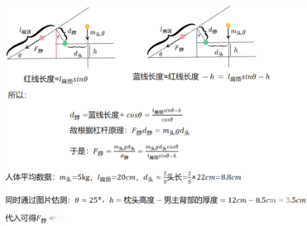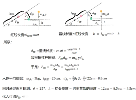 那么,杨洋的颈椎到底会承受多大的压力?有网友根据杠杆原理,也就是头的重力矩就等于颈部肌群的牵引力矩进行了测算。
