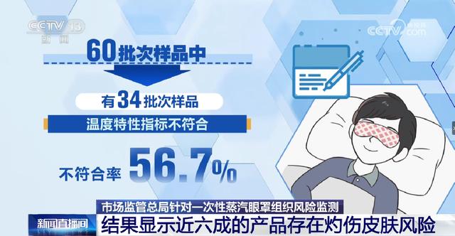 (人民日报健康客户端谷雨微)7月23日,央视新闻每周质量报告栏目播出了国家市场监督管理总局针对一次性蒸汽眼罩的相关抽检结果。结果显示,一次性蒸汽眼罩温度特性指标不符合率达56.7%,部分蒸汽眼罩发热时间超过了标准限值的10倍,存在灼伤使用者眼部皮肤的风险。