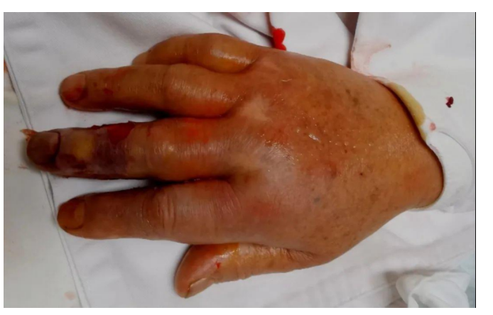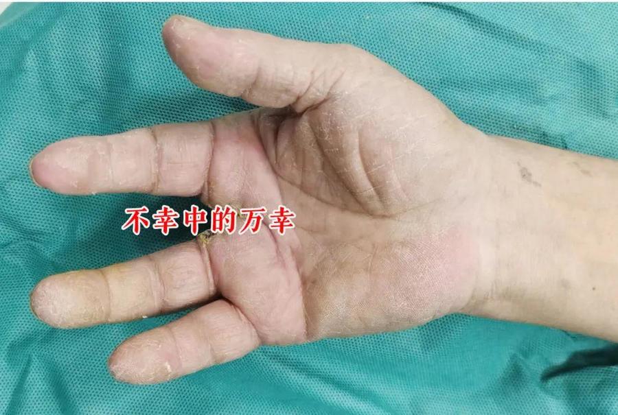 此时,老林的右手中指剧烈疼痛,且波及邻近手指,手背弥漫性肿胀、大水疱及糜烂、坏疽,感染有蔓延的趋势。