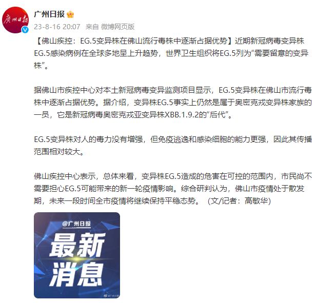佛山疾控中心表示,总体来看,变异株EG.5造成的危害在可控的范围内,市民尚不需要担心EG.5可能带来的新一轮疫情影响。综合研判认为,佛山市疫情处于散发期,未来一段时间全市疫情将继续保持平稳态势。(文/记者:高敏华)