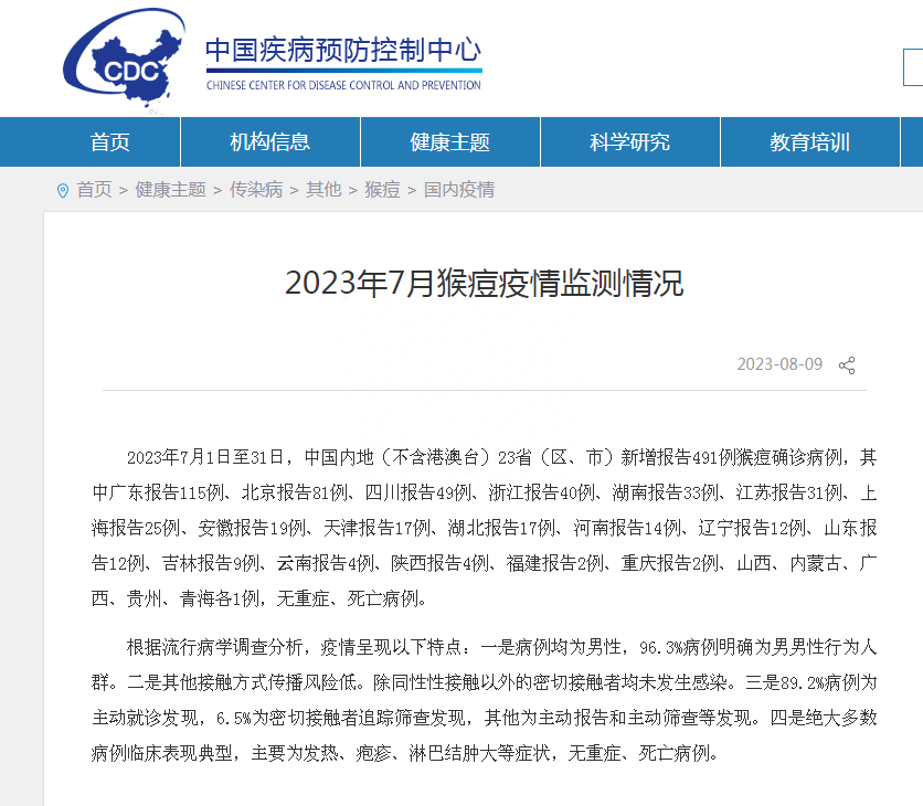 据中国疾病预防控制中心此前公布的数据,2023年7月1日至31日,中国内地(不含港澳台)23省(区、市)新增报告491例猴痘确诊病例,其中广东报告115例、北京报告81例、四川报告49例、浙江报告40例、湖南报告33例、江苏报告31例、上海报告25例、安徽报告19例、天津报告17例、湖北报告17例、河南报告14例、辽宁报告12例、山东报告12例、吉林报告9例、云南报告4例、陕西报告4例、福建报告2例、重庆报告2例、山西、内蒙古、广西、贵州、青海各1例,无重症、死亡病例。