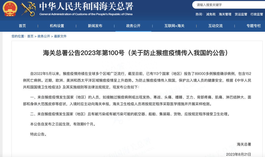 (关于防止猴痘疫情传入我国的公告)