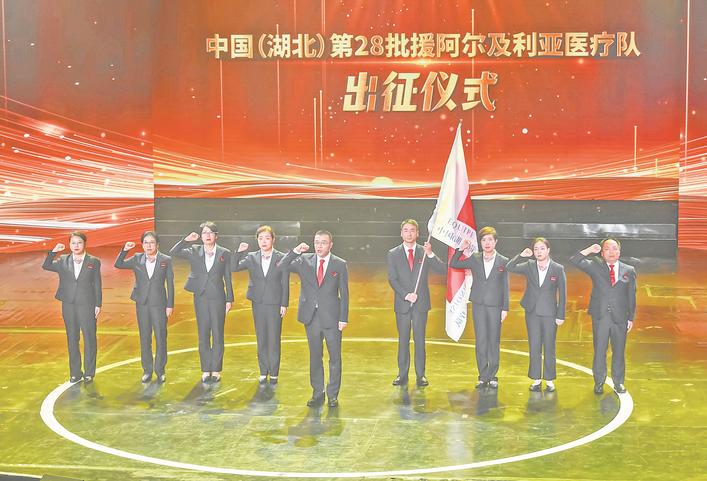 楚天都市报极目新闻讯(记者郑晶晶 王永胜 通讯员孙苗 王莎)“不畏艰苦 甘于奉献 无私奉献 救死扶伤……我们将铭记使命,不负重托,为增进中国和阿尔及利亚人民友谊、为建设中非共同体、为促进世界和平作出积极贡献!”今年,是中国援外医疗队派遣60周年,也是湖北向阿尔及利亚派遣援外医疗队60周年。8月28日,由湖北省卫生健康委员会主办的“湖北省援外医疗队派遣60周年纪念分享会暨第28批援阿尔及利亚医疗队出征仪式”在湖北广播电视台800平米演播厅举行,81位即将出征的中国(湖北)第28批援阿尔及利亚医疗队队员面对飘扬的国旗庄严宣誓。他们刚刚结束了五个月的集中培训,即将赴阿尔及利亚执行为期两年的援外医疗任务。