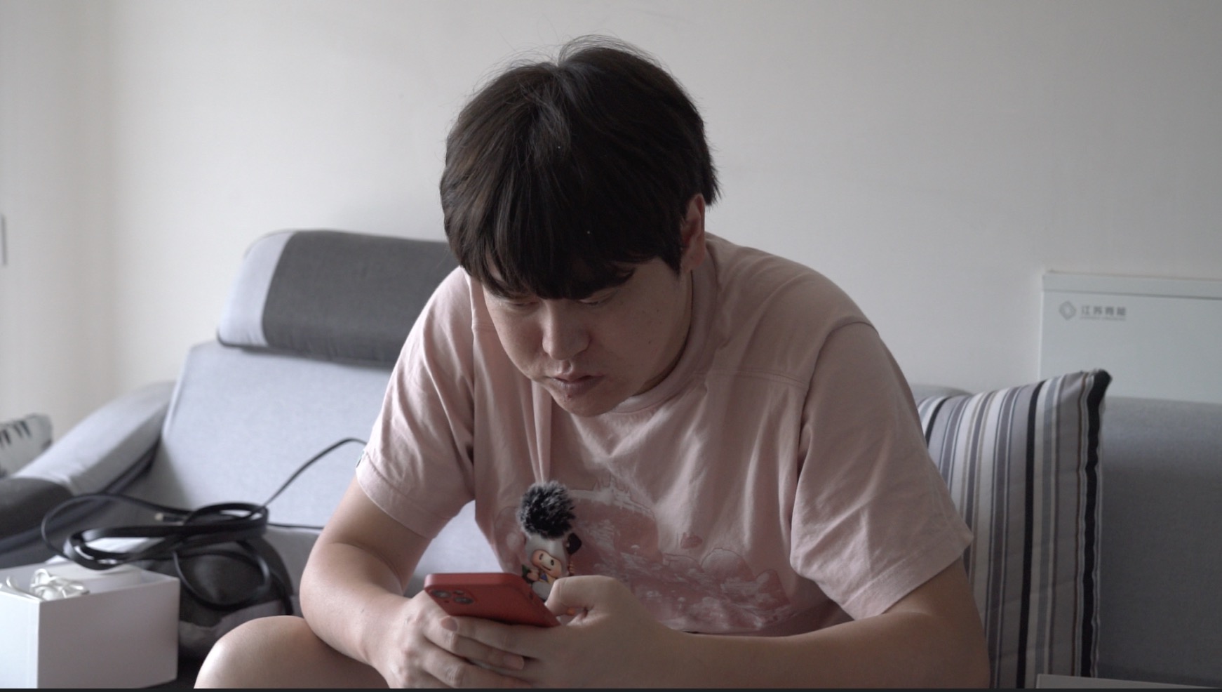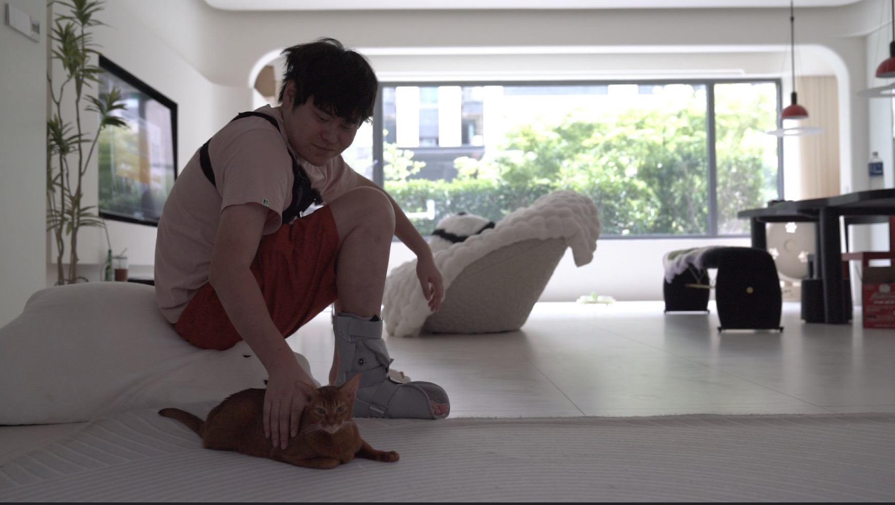 抬头的一瞬间,他像换了一个人,笑容重新出现在脸上,说话时音调变高,语速加快。他套上一件粉色T恤,黑白格子棉布短裤,唱着歌从床上滑下来。此时,他是个三十一岁的青年,高个子,阔嘴巴,身材微胖,神情坚定。新的一天开始了。