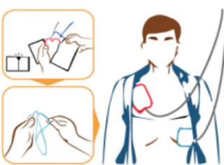 2.打开盖子,取出电极片。让患者仰面平躺,按要求正确粘贴电极片。(前侧位或者前后位。)