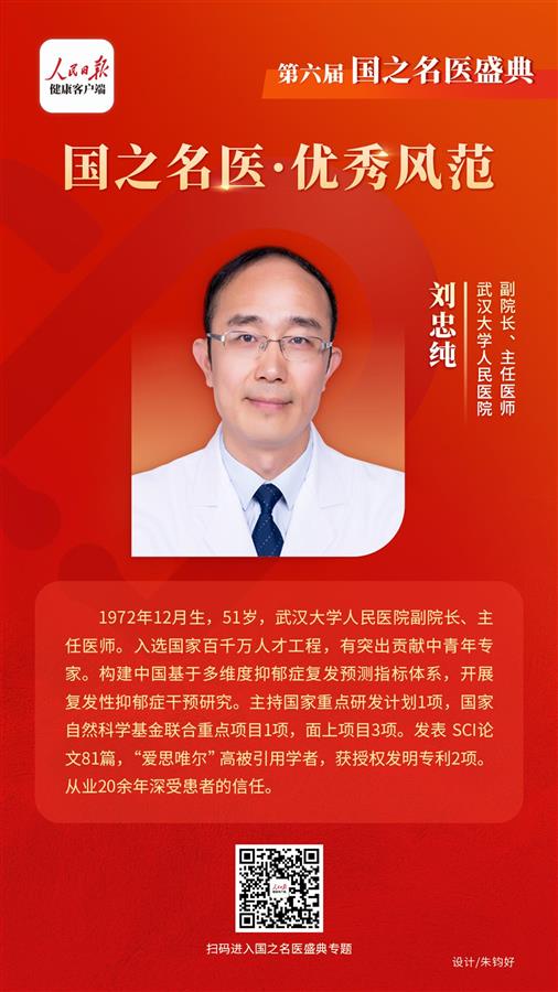 刘忠纯教授,武汉大学人民医院副院长、一级主任医师。入选国家百千万人才工程,国家有突出贡献中青年专家。他从业20余年深受患者的信任,致力于构建中国基于多维度抑郁症复发预测指标体系,开展复发性抑郁症干预研究。主持国家重点研发计划1项,国家自然科学基金联合重点项目1项,面上项目3项。发表SCI论文81篇,获评“爱思唯尔”高被引用学者,获授权发明专利2项。