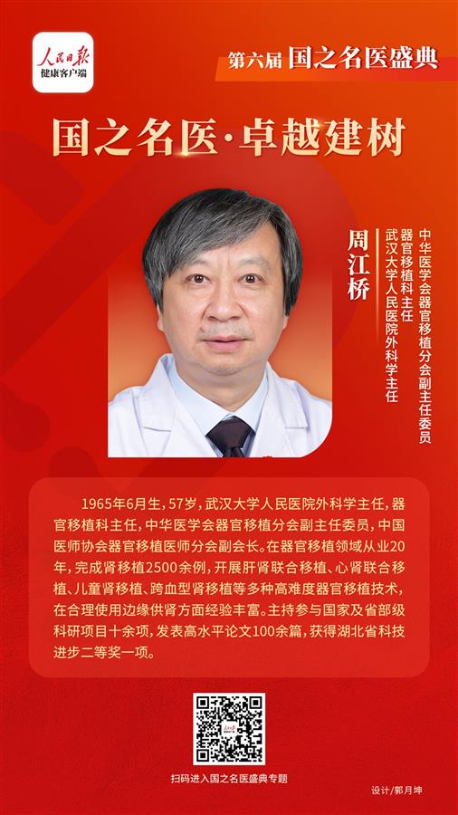周江桥教授,武汉大学人民医院外科学主任、器官移植科主任,兼任中华医学会器官移植分会副主任委员,中国医师协会器官移植医师分会副会长。他在器官移植领域从业20年,完成肾移植2500余例,主导开展肝肾联合移植、心肾联合移植、儿童肾移植、跨血型肾移植等多种高难度器官移植技术,在合理使用边缘供肾方面经验丰富。主持参与国家及省部级科研项目十余项,发表高水平论文100余篇,获得湖北省科技进步二等奖一项。