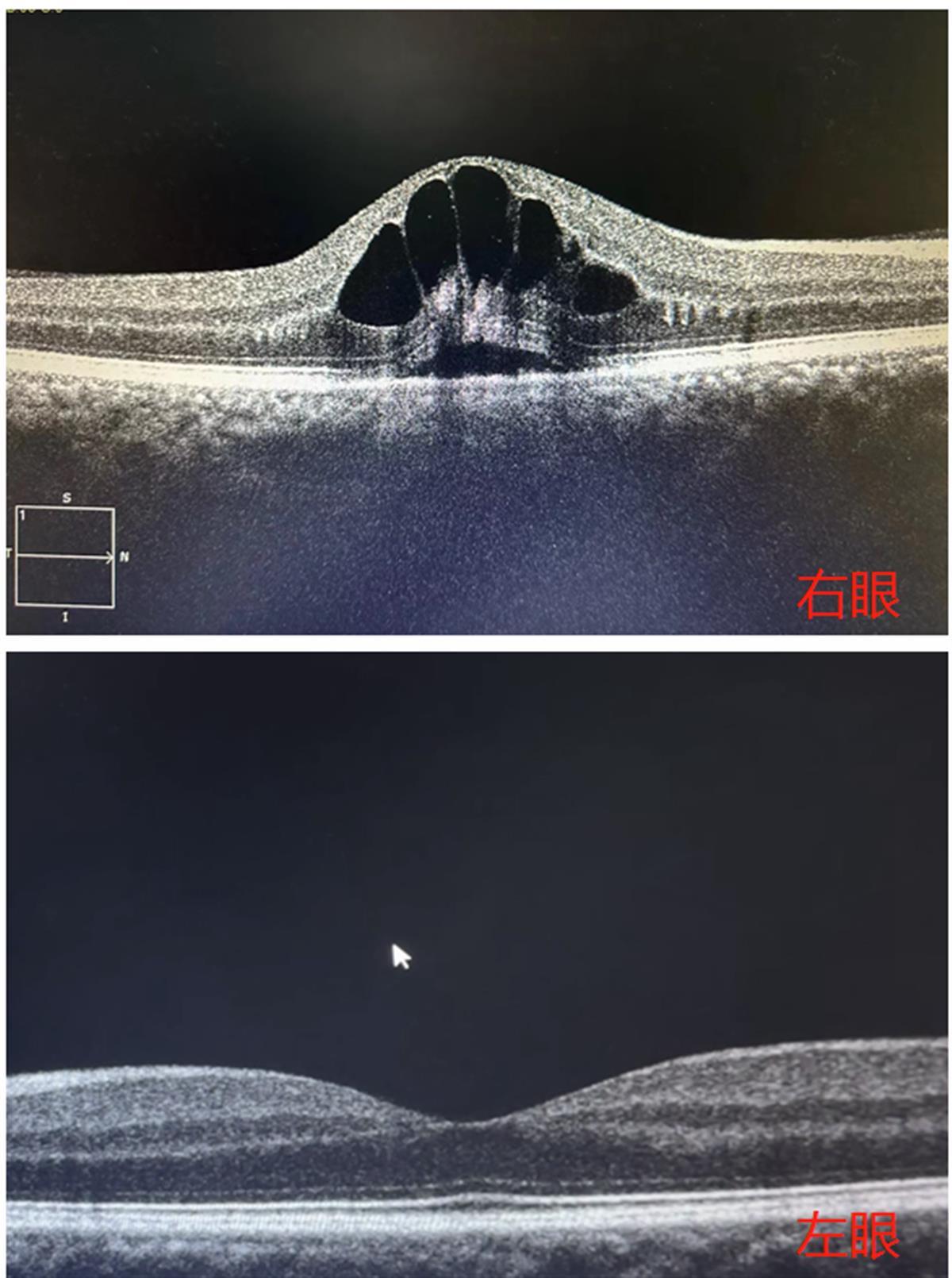检查可见,眼底黄斑区出现“花瓣”状囊样水肿