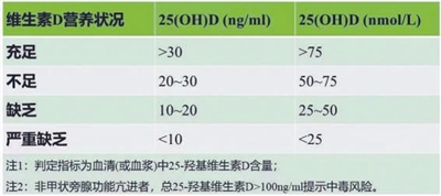 25(OH)D[25-羟基维生素D3,即25-羟胆化(固)醇,也叫25-羟胆钙化醇、钙二醇,医学上称为胆钙化醇,简写为25(OH)D]是公认的评价人体维生素D营养状况的最可靠指标,也是血液中维生素D的主要循环形式,稳定性好。新发布的《维生素D营养状况评价及改善专家共识》中,维生素D营养状况分4类:正常、不足、缺乏、中毒。判定标准跟美国医学研究院、英国骨质疏松学会和澳大利亚骨矿学会等保持一致。“如果你怀疑自己维生素D不足或缺乏,可以去医院抽血化验血清25(OH)D。化验结果会清晰告诉你维生素D的营养状况”。王兴国建议大家可以去医院做一下检测,这样就可以清楚自己是否缺乏维生素D,也可以有的放矢地去进行补充。具体判断标准如下表所示。