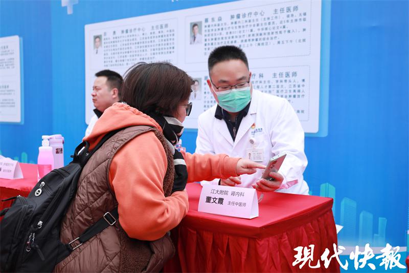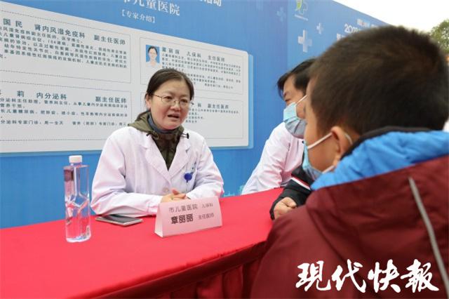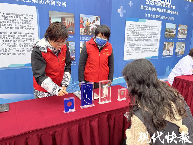江苏省江原医院、江苏省荣军医院的专家展位前来了不少咨询的市民。"今天有新病人,也有老病人。不少病人得知消息后赶来了现场。现在年轻女性甲状腺方面问题多发,但是大多数问题并没有我们想得那么可怕,可以定期随访遵医嘱。"省江原医院甲状腺外科副主任医师邹贤表示。江苏省太湖疗养院义诊位前的体质茶饮、体质泡脚方吸引了不少市民关注。江苏省血吸虫病防治研究所则带来了各类食源性寄生虫标本,生动科普让市民连连表示收获不少。