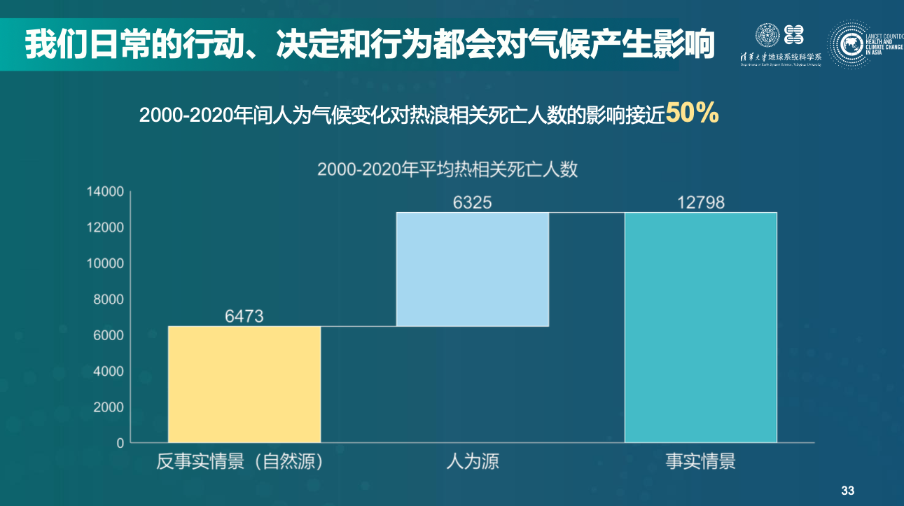 2000-2020年的20年间,中国每年和热浪相关的死亡人数有将近1.3万例,其中有约6500例是自然源气候变化导致的,约6300例是人为源气候变化导致的,也就是说,将近50%的影响来自人为气候变化。