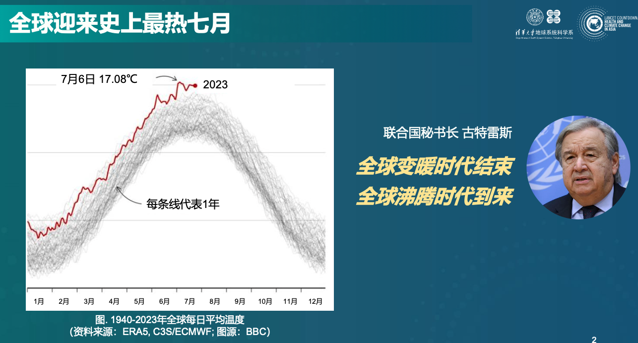 世界气象组织称,2023年极有可能是地球12万年来最热的一年。联合国秘书长古特雷斯在发言中表示,全球变暖的时代已经结束,现在是全球沸腾的时代。频发、广发、强发、并发的极端气候事件已经成为我们生活的“新常态”,持续攀升的气候变化健康风险,正在为我们敲响气候警钟。