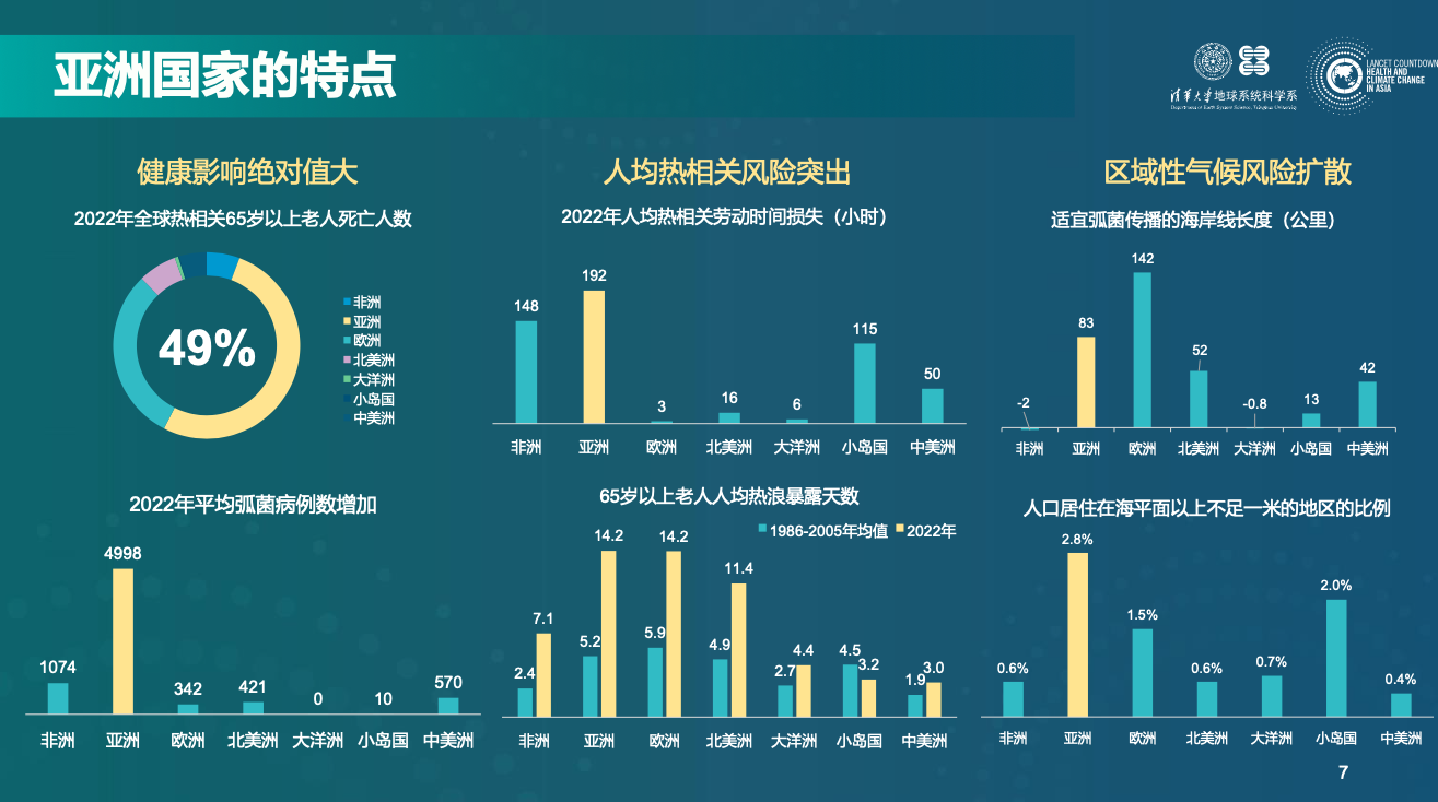 亚洲具有着健康影响绝对值高、人均热相关风险突出、区域性气候风险扩散、空气污染的健康损害大、能源结构低碳转型压力大、研究关注度高等特点。2022年全球热相关65岁以上老人死亡有49%发生在亚洲,亚洲人口居住在海平面以上不足一米的地区的比例达到2.8%,超过了第二位小岛国的2.0%。