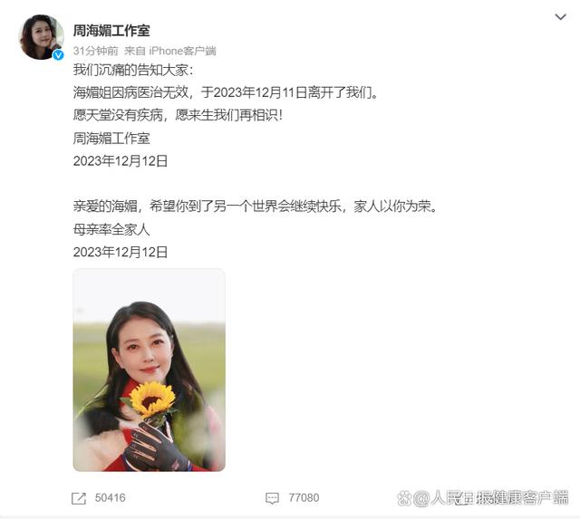 12月12日,周海媚工作室发布:海媚姐因病医治无效去世,愿天堂没有疾病,愿来生我们再相识!