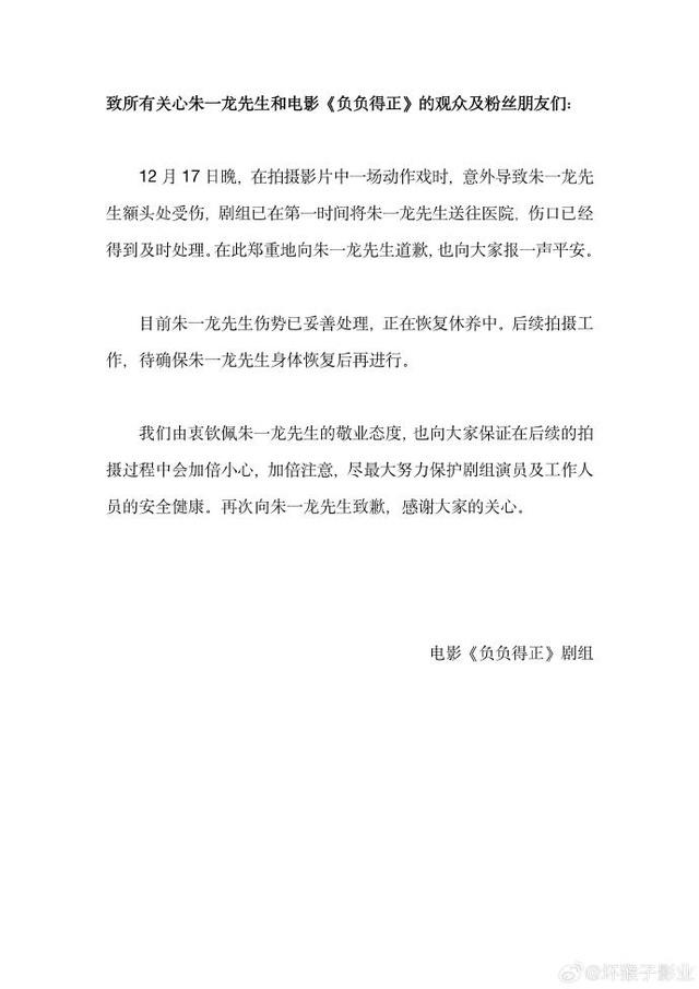 12月18日,坏猴子影业在微博发文透露,演员朱一龙在拍摄电影《负负得正》的一场动作戏时,因意外导致其额头受伤,并表示剧组已第一时间将朱一龙送往医院,伤口已得到及时处理,后续拍摄工作待确保他身体恢复后再进行。