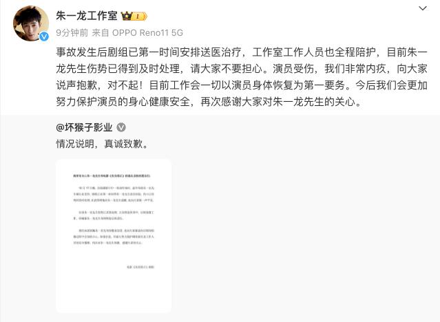 随后,朱一龙工作室转发坏猴子影业的情况说明并报平安:“事故发生后剧组已第一时间安排送医治疗,工作室工作人员也全程陪护,目前朱一龙先生伤势已得到及时处理,请大家不要担心。”