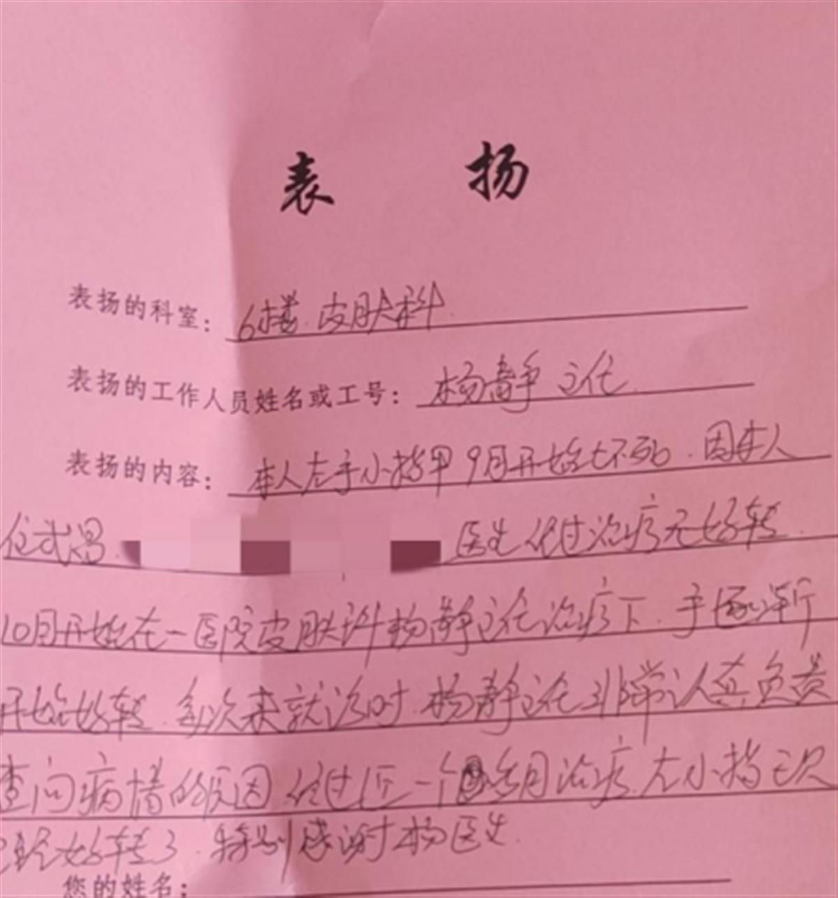 “在杨主任的治疗下,手逐渐好转,特别感谢。”日前,结束最后一次复诊,离开医院前,市民李女士将一封手写感谢信交至病员服务中心,感谢该院皮肤科甲病专家杨静治好了她的“绿指甲”。