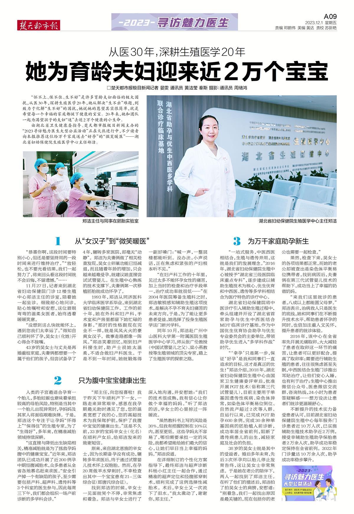12月27日,经过6个多月的推荐评选,由湖北省卫生健康委员会指导、楚天都市报·极目新闻主办的“2023寻访魅力医生大型公益活动”正式落下帷幕,湖北省妇幼保健院生殖科主任郑洁获评“2023魅力医生”荣誉称号。
