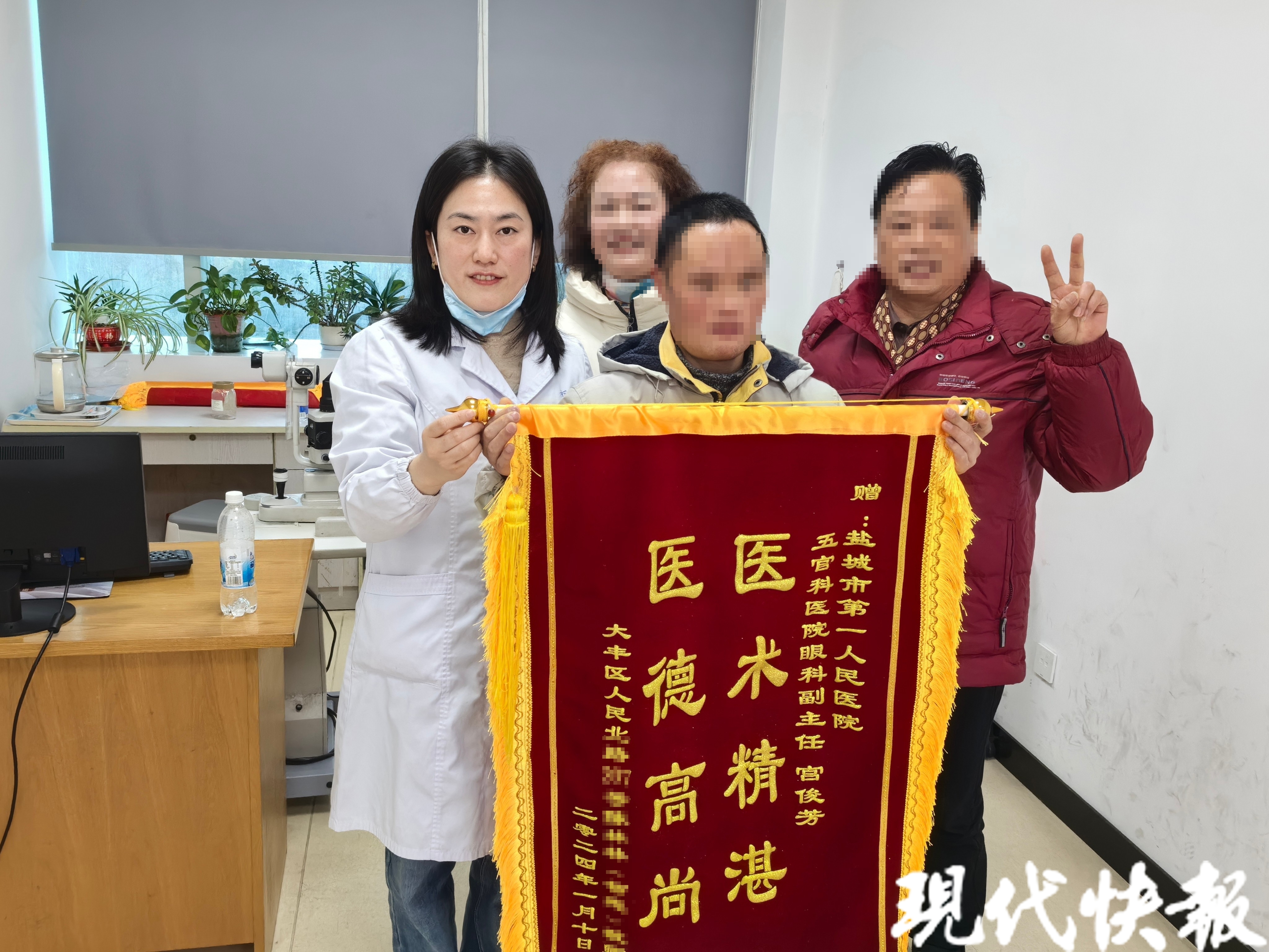 现代快报讯(通讯员 严轩)1月15日,大丰区的陈先生来到盐城市第一人民医院五官科医院,给该院的眼科医生宫俊芳送上了“医术精湛,医德高尚”锦旗,感谢她冒着风险,给他做完手术,让他重见光明。