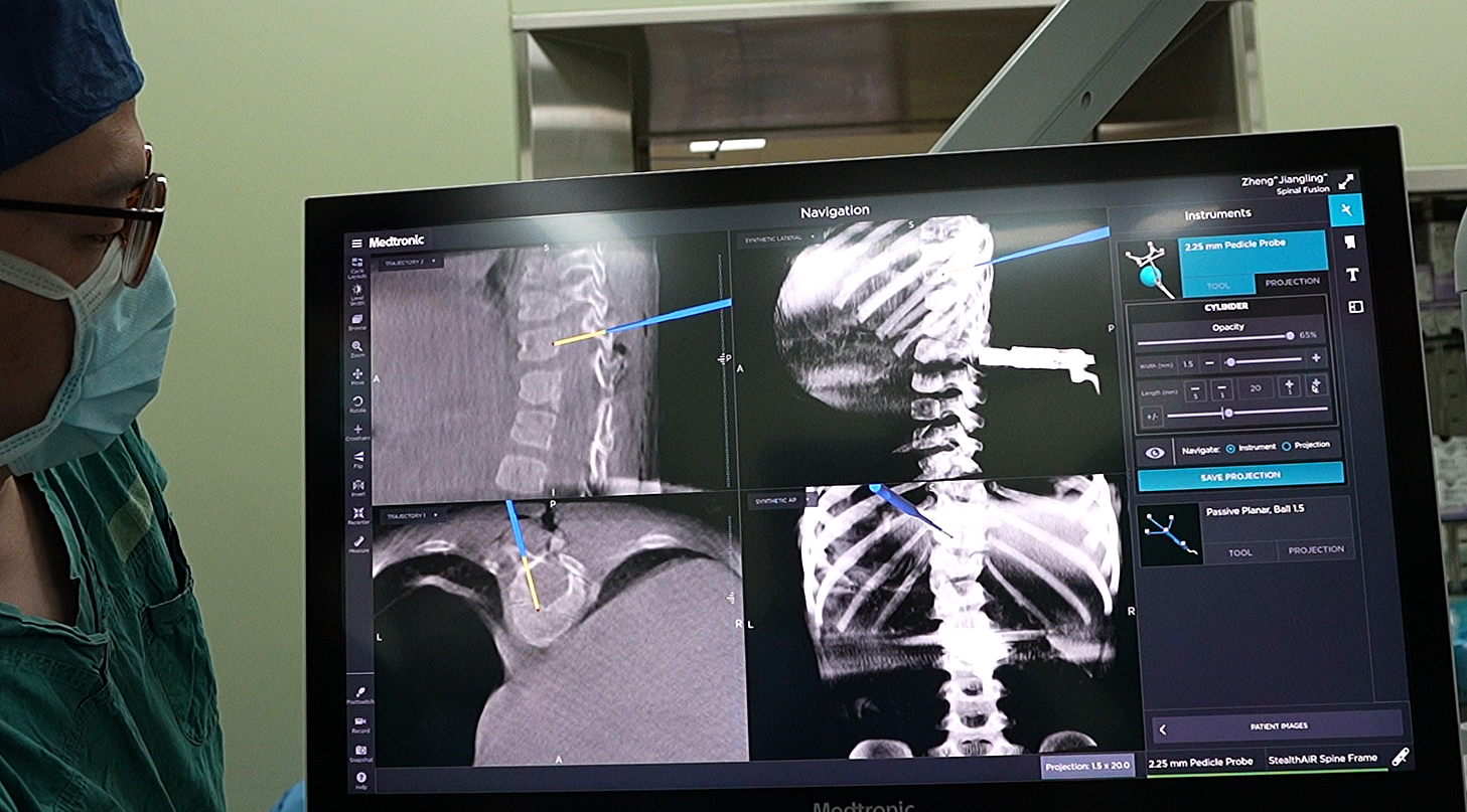 复旦大学附属儿科医院骨科主任王达辉表示,脊柱椎弓根附近结构复杂,有脊髓、神经根、大血管等,尤其是严重脊柱畸形的患者,本身发育畸形,加上每个人的椎弓根形态都不同,主刀医师若一不小心,椎弓根螺钉偏内进入椎管易造成脊髓损伤,椎弓根螺钉偏外易降低矫形力,螺钉穿破椎体前壁易造成血管损伤。因此,传统的严重脊柱侧后凸畸形手术仍然存在极大的风险和挑战。