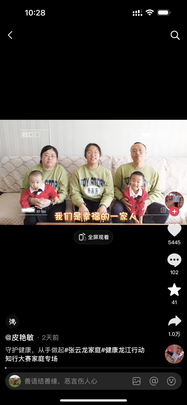 双鸭山市战队短视频展播,冠军家庭双鸭山市战队的作品点赞5445,转发量达到了1万+(央广网发网络截图)